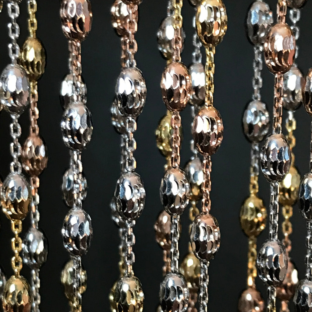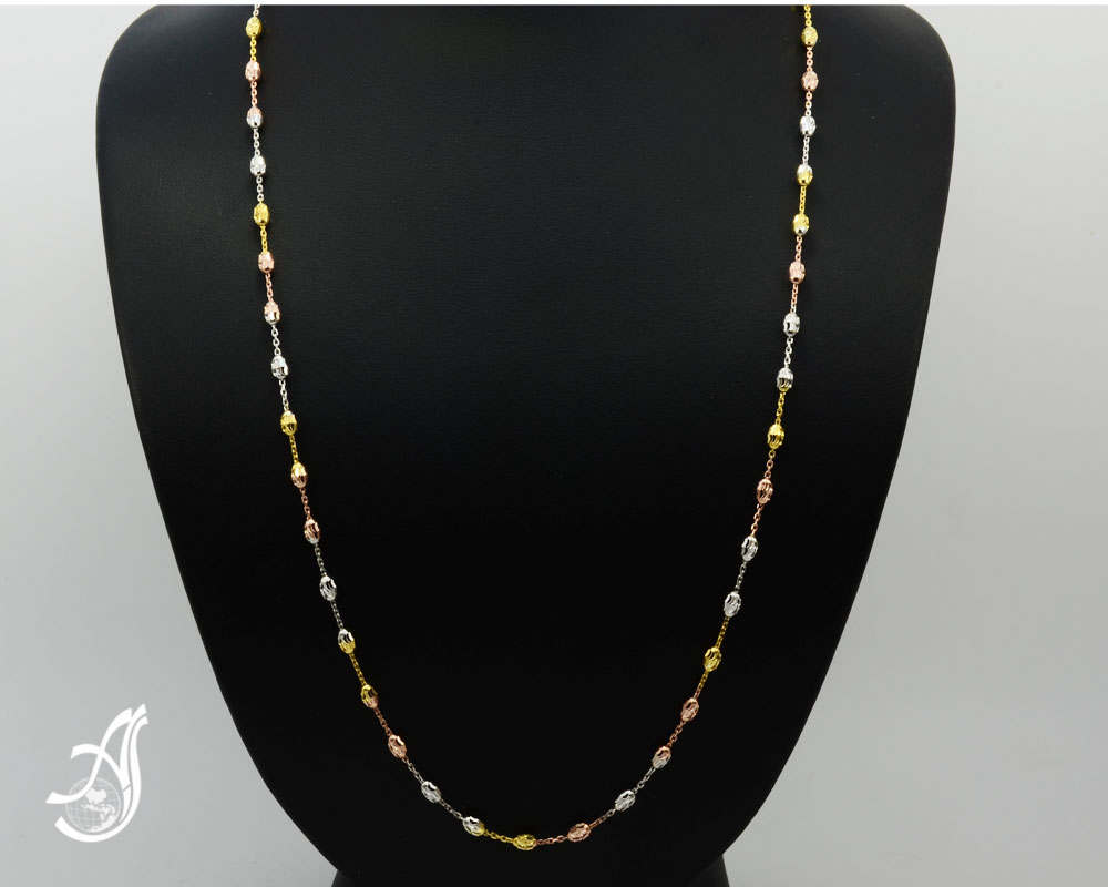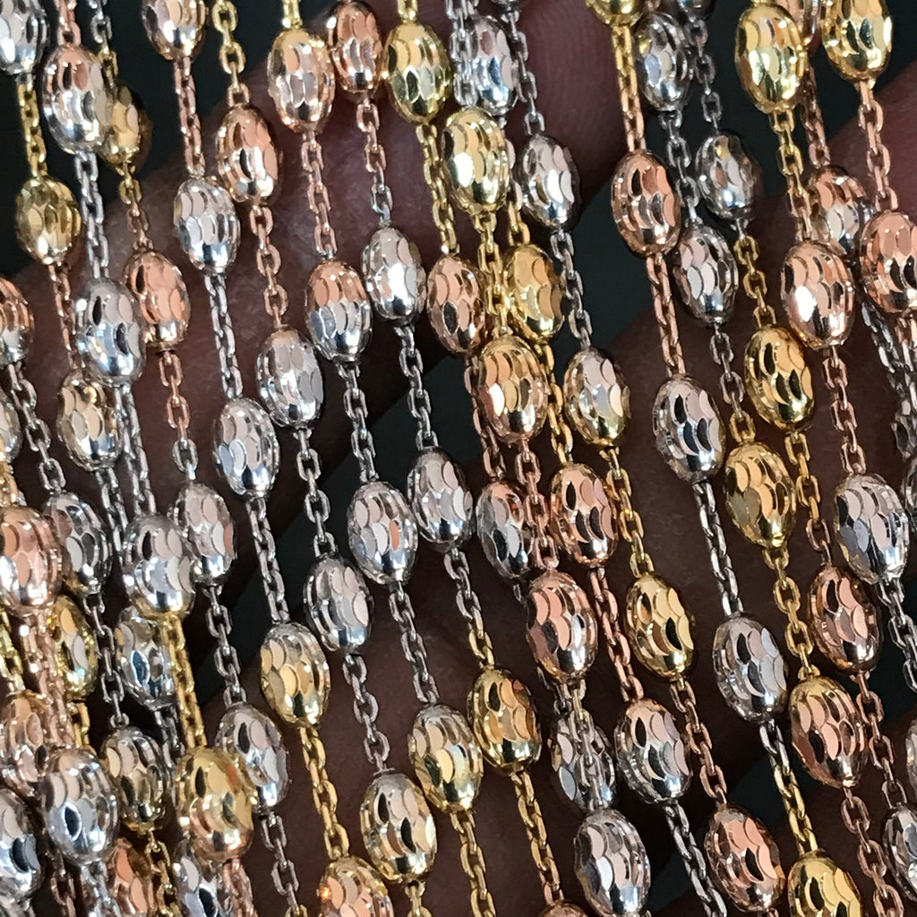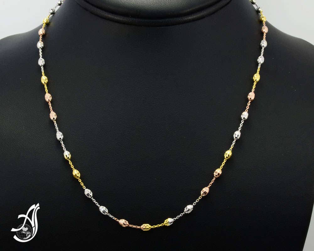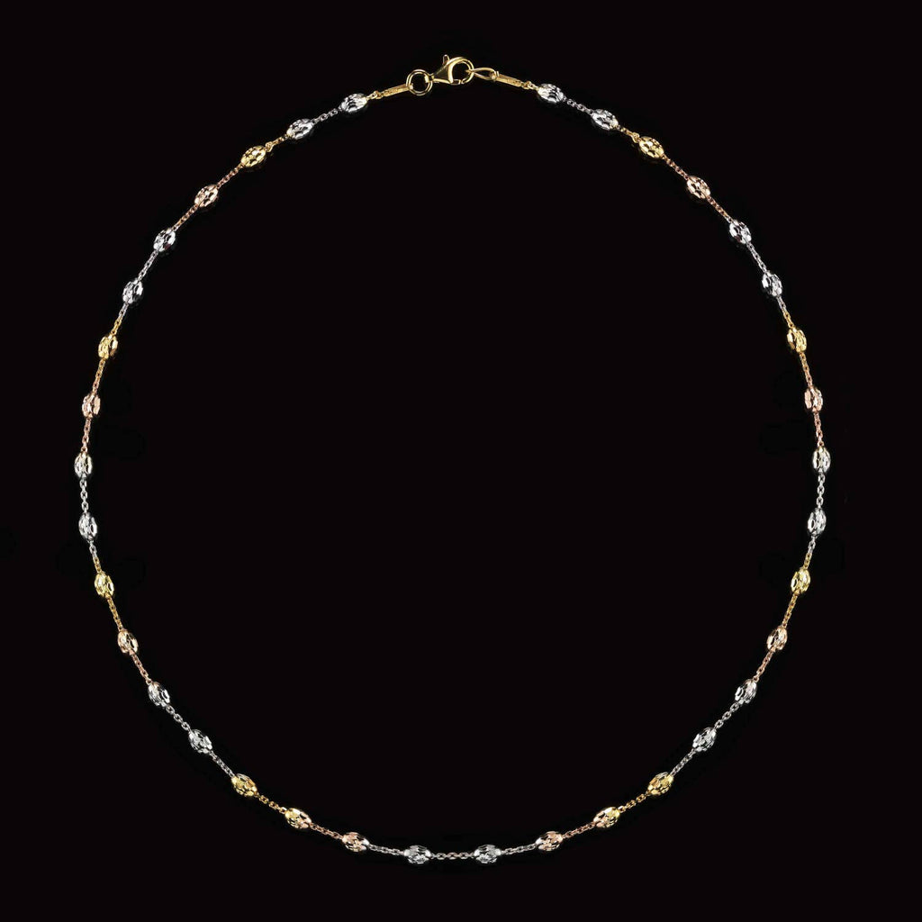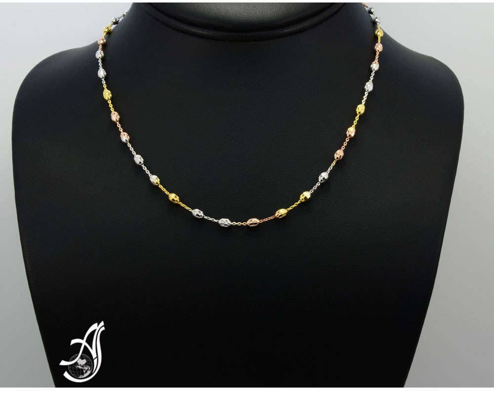 925 Sterling Silver Italian Necklace chain, Tri-color Yellow, Rose & Silver,14 k Gold polish and available in multiple lengths . It is very popular & very different ,Unusual chain necklace with Tricolor Station Ovals and shiny facet on it Glitters for Rich & famous Look l. Fine craftsmanship, made in Italy.